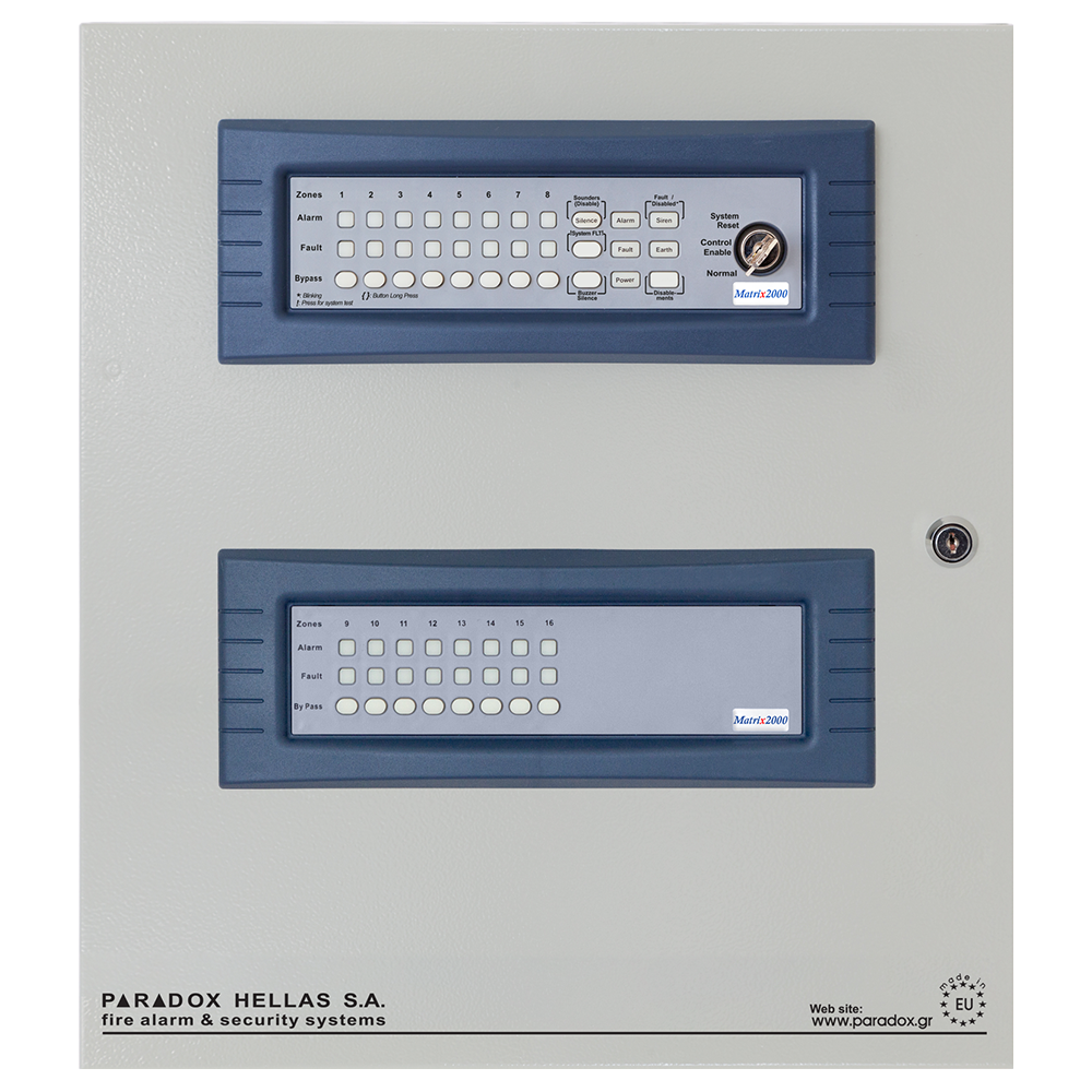 16 Ζώνες σύνδεσης ανιχνευτών ή κομβίων αναγγελίας φωτιάς επιτηρούμενες με EOL αντιστάσεις.